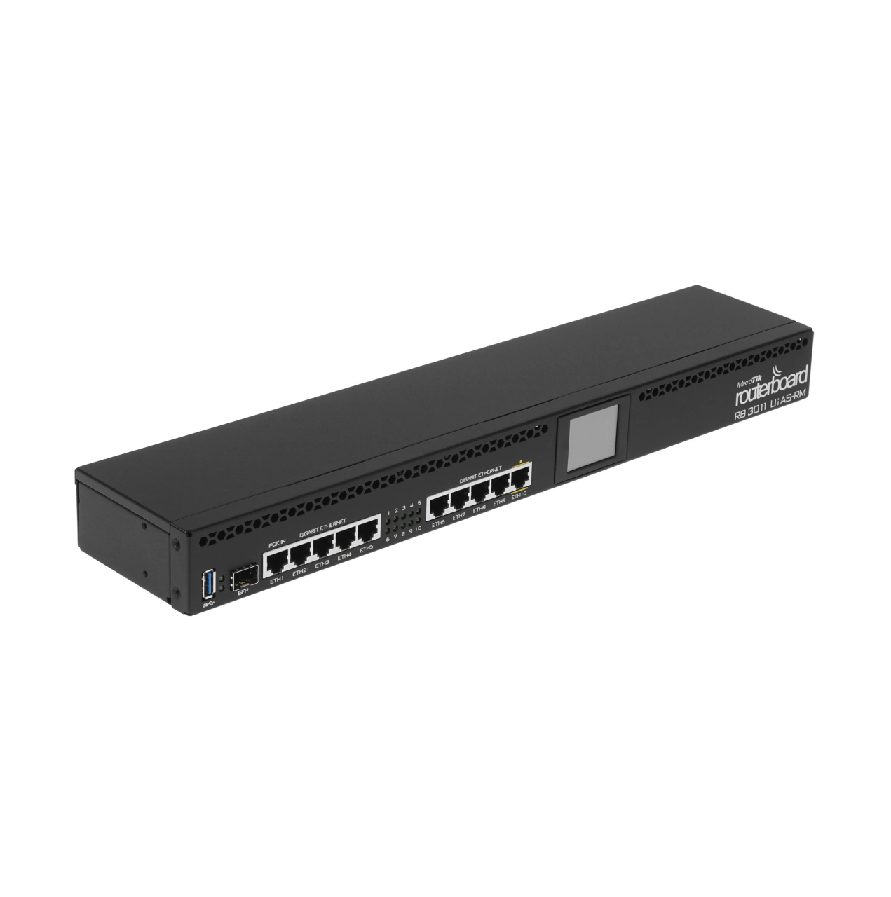 Mikrotik RB3011UiAS-RM на архитектуре ARM имеет 10 гигабитный портов, которые разделены на 2 группы коммутаторов, каркас SFP и полноразмерный порт SuperSpeed USB 3.0 для добавления хранилища или внешнего модема 3G/4G.